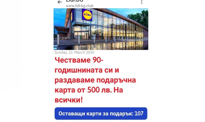 В интернет пространството е налична фалшива Лидл промоция за раздаването на подаръчна карта от 500 лв. във връзка с честване на 90-годишнината на веригата супермаркети. Интернет адресът на сайта, от който се извършва измамата, е сходен с този на официалния сайт. Освен, че мошениците събират лични данни, без абсолютно никакви условия, изисквани от законовата уредба, някои антивирусни програми засичат и три вируса при опит да се посети адреса на мошениците, който е същият като официалния, но с разширение club.