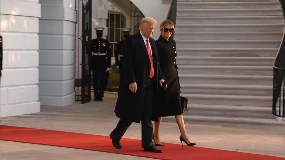 Пред погледите на малка група свои привърженици Тръмп и първата дама Мелания минаха по къс червен килим и се качиха на хеликоптера „Марийн уан“ за краткия полет до авиобазата „Ендрюс“ откъдето ще отлети с „Еър форс уан“ до Флорида. Да служиш като президент беше „честта на целия ми живот“, каза Тръмп пред журналисти, преди да се качи на борда на „Марийн уан“. Във военновъздушната база „Ендрюс“ Доналд Тръмп определи президентството си като четири „невероятни“ години. В заключителната си реч Тръмп заяви: „Ще се върнем под някаква форма“, намеквайки, че ще остане в обществения живот, след като напусне Белия дом. Тръмп продължи, без да споменава лично новоизбрания президент Джо Байдън, че смята, че следващата администрация „ще има голям успех, защото те имат основите за това“, но той им пожела и „голям късмет“.