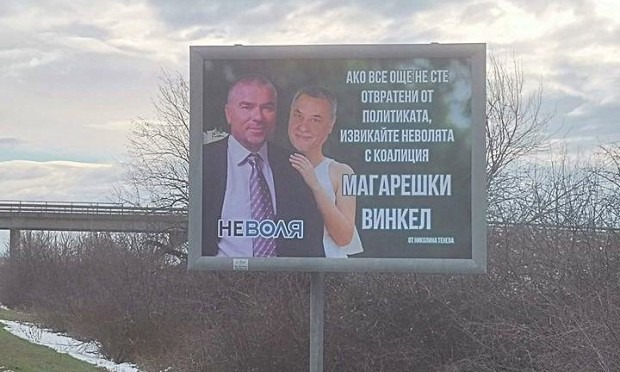 „Ако все още не сте отвратени от политиката, извикайте неволята с коалиция Магарешки винкел – Неволя“ – гласи текстът на паното.