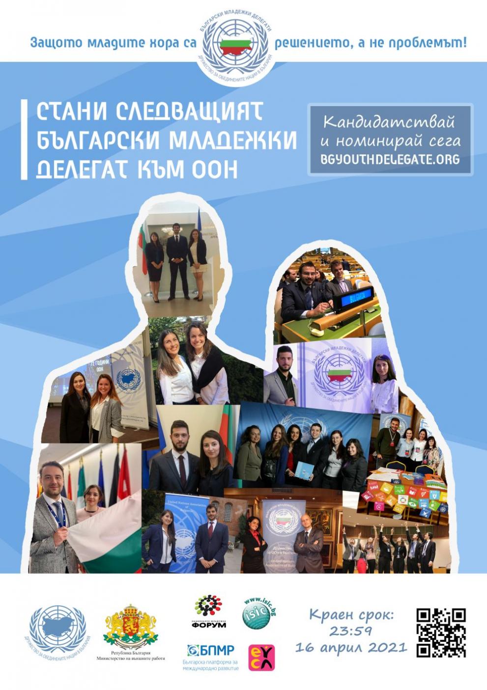 Двама младежки делегати към ООН ще бъдат избрани чрез национален конкурс, който се организира от Дружеството за ООН в България с подкрепата на МВнР. Те ще представляват гласа на младежите в България и ще отстояват техните интереси на най-високо междуправителствено ниво в продължение на 18 месеца – от юли 2021 г. до декември 2022 г.