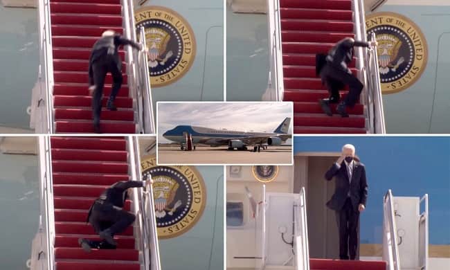 Кадри с падането на Байдън по стъпалата се появиха на 19 март. Белият дом комично обвини вятъра за гафа на Байдън, но тъжният образ на 78-годишния човек, който се спъва безпомощно пред включените камери, породи много шум. А от друга страна вече имаше подозрения, че е влошено здравето на държавния глава на САЩ, като журналистите неведнъж бяха свидетели на това как Байдън бърка думите.