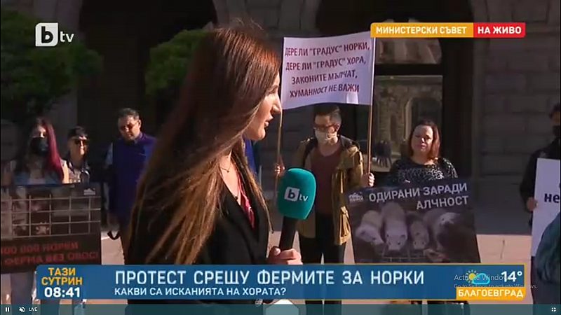 Протестиращи пред МС настояват да се закрие единствената ферма за норки у нас. Тя се намира в Стара Загора. По време на комисията по ревизия стана ясно, че бизнесът с този вид животни се управлява от приближения до Бойко Борисов – Иван Ангелов.