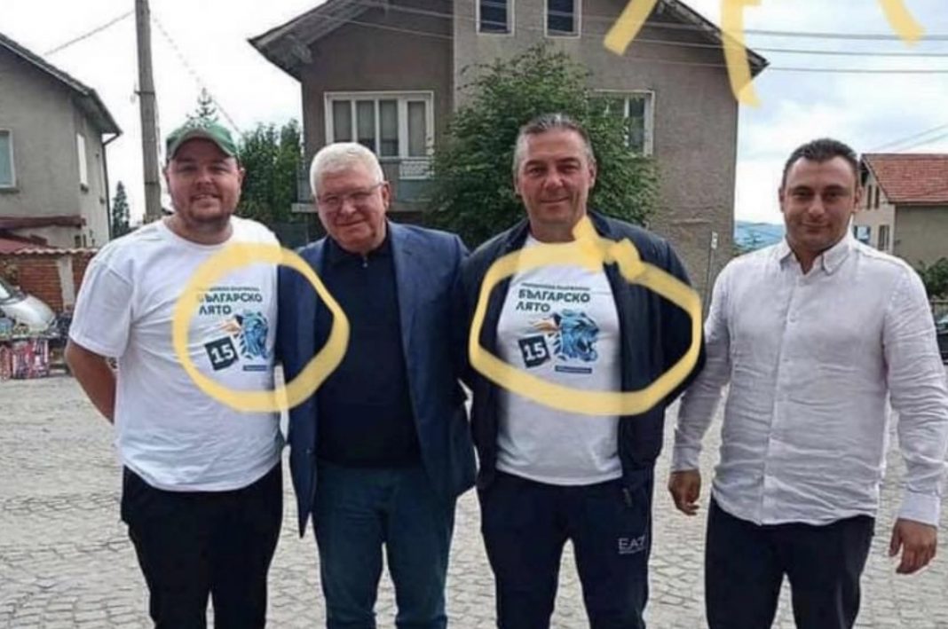 Фотосът показва нахиленият чичо на Влади Горанов, гушнат от двете страни от двама мъже, носещи фланелки на партията на Васил Божков.