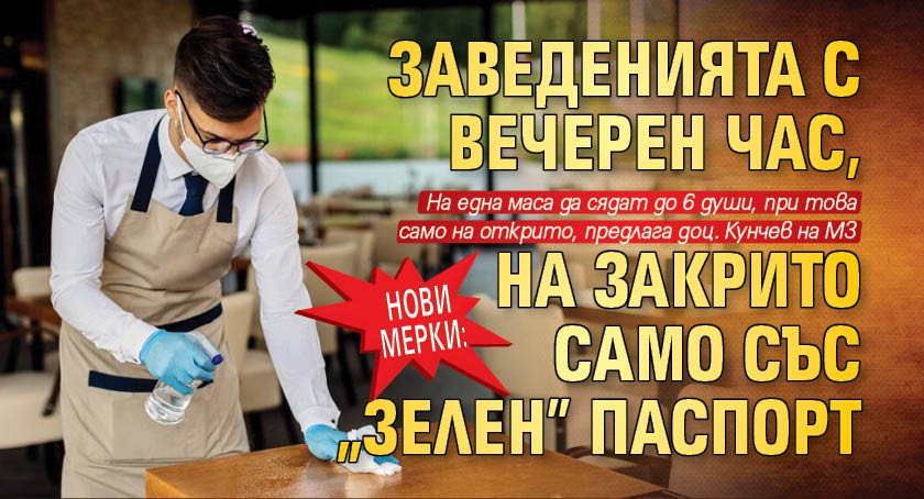 Преустановяване работата на нощни заведения, игрални зали и казина. Алтернативен вариант е работа до 50% от капацитета на обекта само за лица, притежатели на т.нар. зелен (санитарен) паспорт, в т.ч. и при 100 % наличие на зелен паспорт от персонала.