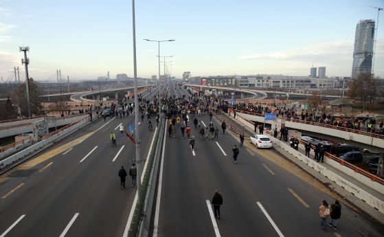 Стотици се събраха в столицата Белград, в Нови Сад и на други места и блокираха основни пътища и мостове за един час в рамките на „предупредителна блокада“.