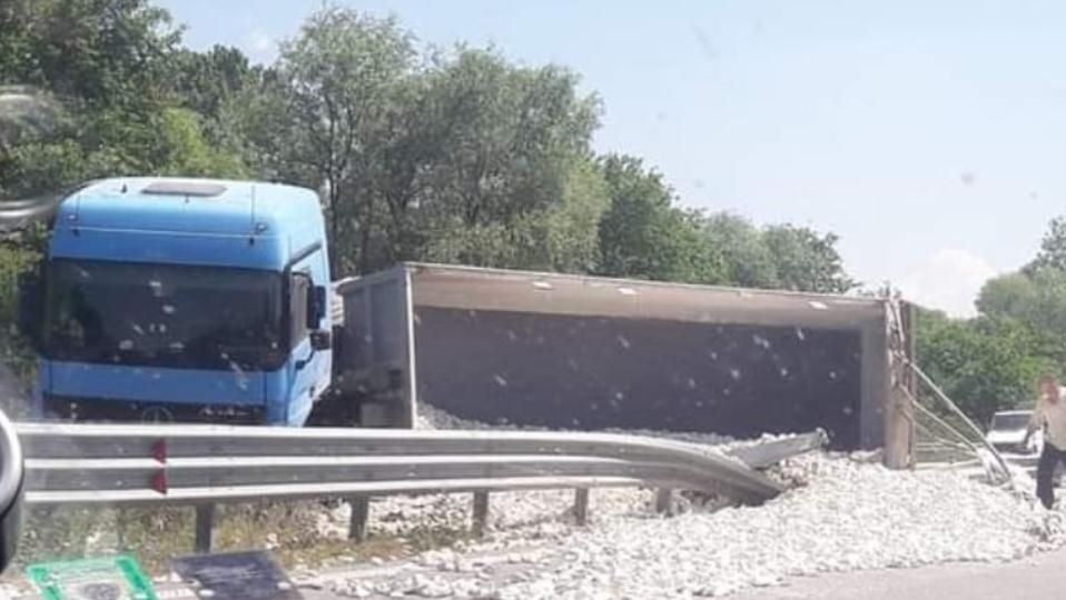 Сигналът за произшествието е получен около 11.30 ч. днес. По първоначални данни няма пострадали хора. Превозваният в камиона товар – баластра, се е разпилял на пътното платно и по тази причина преминаването на останалите автомобили в участъка е силно затруднено. Трафикът се регулира от екипи на сектор „Пътна полиция” и се осъществява в средна и аварийна ленти.