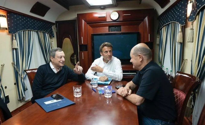 Френският президент Еманюел Макрон, германският канцлер Олаф Шолц и италианският министър-председател Марио Драги напуснаха днес Полша с влак, пътуващ за Киев, съобщиха италиански и германски медии.