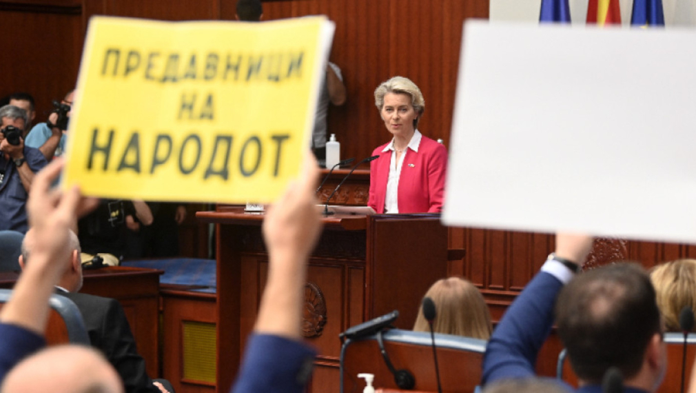 Северна Македония трябва да направи крачка напред към Европейския съюз, каза председателят на Европейската комисия Урсула фон дер Лайен пред македонския парламент преди заседанието, на което депутатите ще обсъдят т. нар. френско предложение за началото на преговори. Тя подчерта, че македонският език и македонската идентичност се признават от Европейския съюз. По думите ѝ, предложената от ЕС преговорна рамка защитава интересите на Република Северна Македония. Междувременно протестиращи замеряха сградата на парламента в Скопие с тоалетна хартия и яйца.