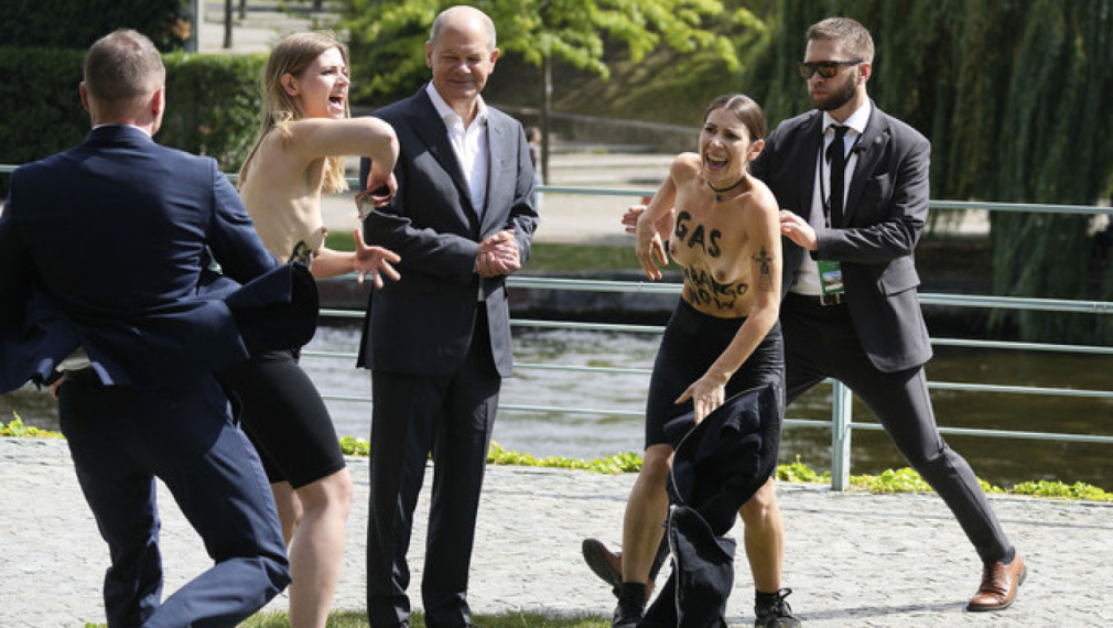 По време на пресконференция в неделя край германския канцлер Олаф Шолц изведнъж се появиха две голи до кръста жени, които са част от протест, призоваващ за ембарго върху вноса на руски газ в Германия по време на войната в Украйна, съобщи ДПА.