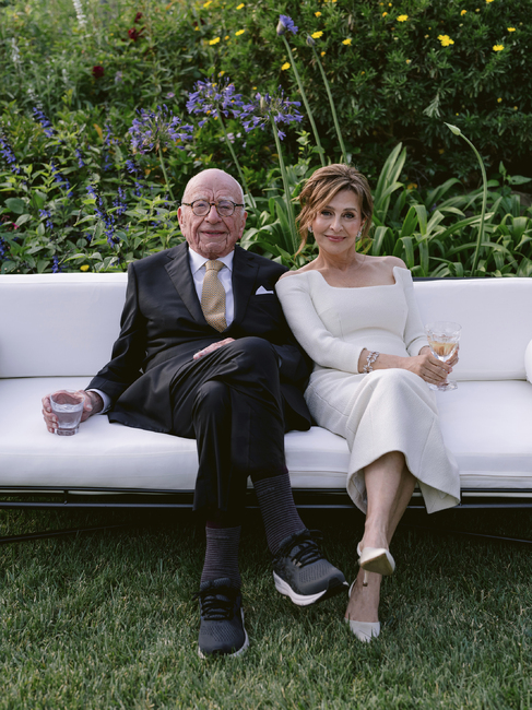 На снимки от сватбата, изпратени до медиите, Мърдок се усмихва до новата си съпруга, облечен с черен костюм и вратовръзка на жълти шарки.