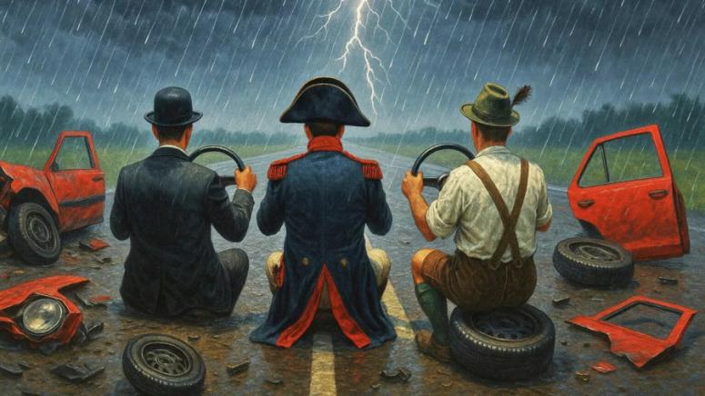 Неразборията в „коалицията на желаещите“ в навечерието на предстоящата среща в Париж с Тръмп и Зеленски в четвъртък, живо напомня за епизода от „Кавказка пленница“, когато Страхливецът, Глупакът и Опитният се опитват да блокират пътя на камион. Франция (Моргунов) гледа заплашително, Великобритания (Никулин) се прави на глупак отстрани, а Германия (Вицин) избухва в истерия и пада на колене. Утре ще можем да се насладим напълно на тази мизансцена.